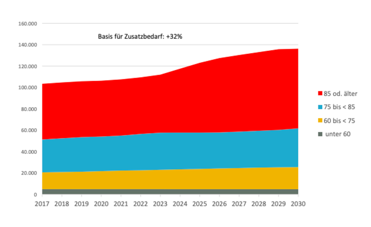Die österreichische Gesamtbevölkerung wird bis 2030 um 6 % wachsen und gleichzeitig die Anzahl der Menschen ab 75 um rund 25 % steigen, am stärksten in der Altersgruppe zwischen 85 und 89 Jahren.