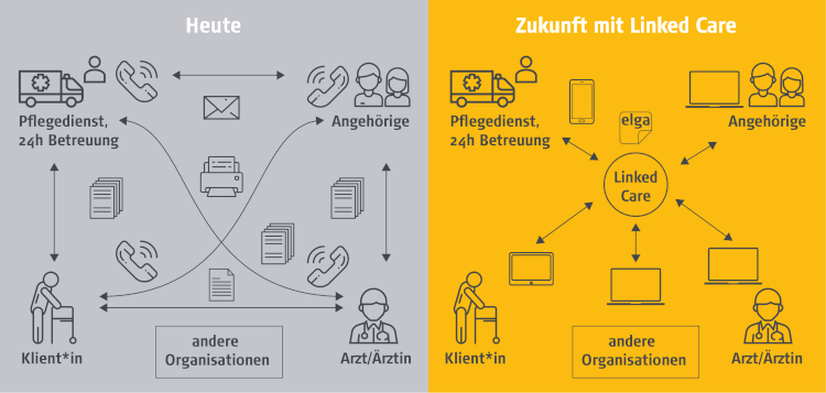 Auch das österreichische Forschungsprojekt „Linked Care“ – gestartet von der Forschungsförderungsgesellschaft (FFG), geleitet vom FH Campus Wien und entwickelt unter der Leitung von myneva – beschäftigt sich mit übergreifender Kommunikation.