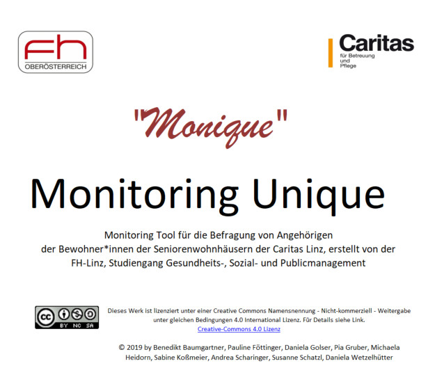 Zu Gunsten eines effizienten und effektiven Qualitätsmanagements in Seniorenwohnhäusern hat die Caritas für Betreuung und Pflege, Oberösterreich in Zusammenarbeit mit der FH Oberösterreich, Campus Linz einen standardisierten Fragebogen zur Befragung von Angehörigen der Bewohner*innen entwickelt. Dieser ist mit Monique - ein eigens für diese Befragung entwickeltes Tool zur Ergebnisaufbereitung - verknüpft. Dadurch ist die Aufbereitung der erhobenen Daten im Zuge von Angehörigenbefragungen künftig mit minimalem Aufwand möglich.