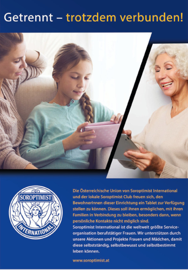 ...und gemeinsam mit den 58 Clubs in Österreich 120 Tablets verschiedenen Häusern in ganz Österreich geschenkt. Soroptimistinnen sind Frauen, die in einer großen Bandbreite von Berufen tätig sind. Sie verfügen über vielfältige Fachkompetenzen, Talente, Interessen und Kulturen. Dieses Know-how wird in Engagement umgesetzt: für die Verbesserung der Stellung der Frau und die Förderung der Menschenrechte.„Gerade in Alten- und Pflegeheimen ist der Anteil der Frauen sowohl bei den Beschäftigten als auch von Bewohnerinnen besonders hoch. Es war uns daher ein besonders Anliegen, die Einsamkeit von Bewohnerinnen und Bewohnern in diesen Tagen – und auch die Sehnsucht der Angehörigen nach Oma und Opa zu stillen!“, begründet Unions-Präsidentin Marcella Sigmund-Graff, MBA die Aktion und ergänzt: „Auf dem Tablet sind die Personen gerade für alte Menschen viel besser zu sehen, als auf einem Handy-Display.“