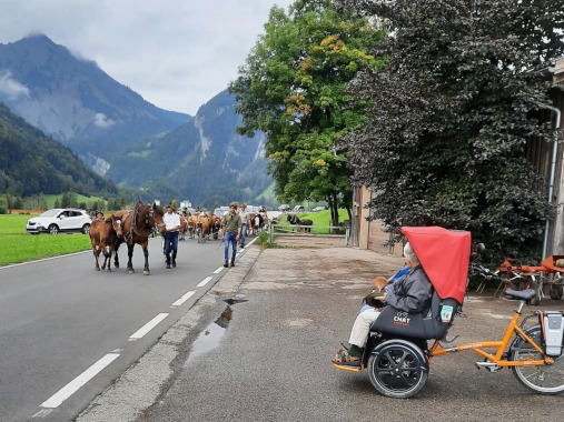 Unsere Rikscha haben wir seit Anfang Sommer und sie war die ganze Saison, wenn es wettertechnisch möglich war, unterwegs. Unsere Bewohner des Josefheims, des Fechtig-Hus und Leute aus dem Dorf haben tolle Ausfahrten genossen. Mit der Rikscha kommen sie wieder an Plätze, an denen sie schon lange oder noch nie waren. Endlich wieder mal dem Alpabtrieb zuschauen oder Bekannte aus dem Dorf treffen. Auch wenn unsere Zivildiener oder Ferialpraktikanten zu einer Fahrt einladen, gibt es immer Freiwillige. Dabei sein bei kleineren Erledigungen wie z.B. was in der Apotheke holen, im Laden was besorgen oder einfach mal ins Cafe Natter nach Bezau auf ein Eis gehen, die Rikscha ist eine immense Bereicherung für unsere Bewohnerinnen und Bewohner.