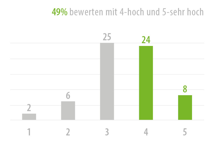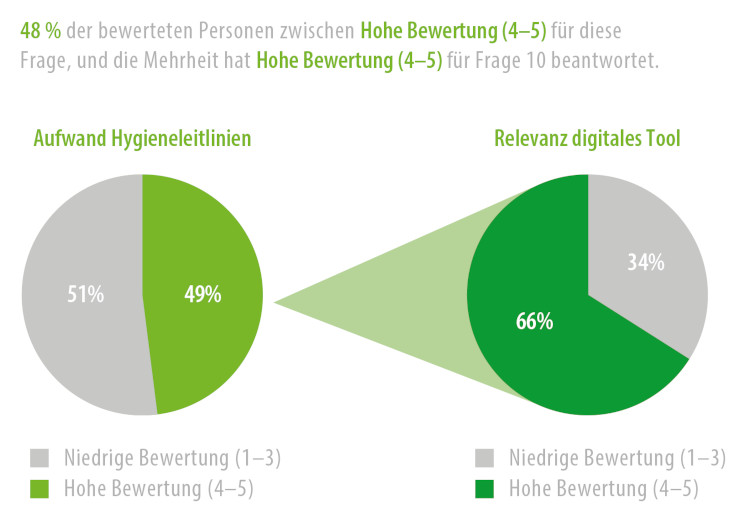 Von diesen 49% der Teilnehmer, welche den Aufwand rund um das Thema Hygieneleitlinien mit 4-hoch und 5-sehr hoch bewertet haben – haben wiederum 66% die Relevanz für ein digitales Tool, um diesen Anforderungen gerecht zu werden als 4-relevant und 5-sehr relevant eingestuft.