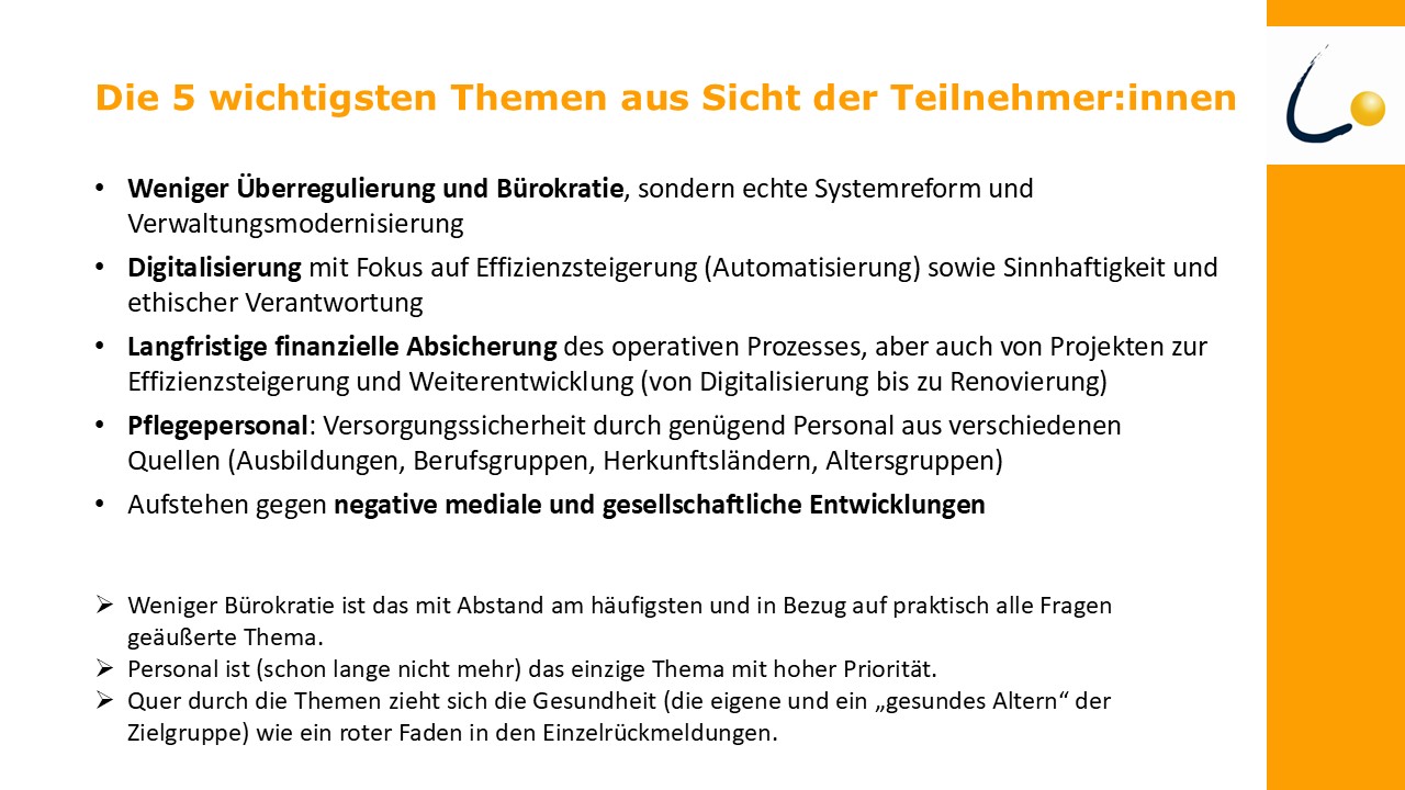 Das am häufigsten und in Bezug auf praktisch alle gestellten Zukunftsfragen genannte Leitwort ist die Bürokratie bzw. viel mehr eine deutliche Reduktion von überbordender Bürokratie. Regulierungen, die keinen deutlichen Zusatznutzen bringen, sollen abgeschafft bzw. gar nicht erst implementiert werden. Ebenfalls klar ist allen, dass Personal schon lange nicht mehr das einzige Thema mit hoher Priorität ist, sondern dass die Problemlage höchst komplex ist und daher auch vielschichtige Lösungen braucht. Wie ein roter Faden quer durch die Materie zieht sich die Gesundheit – die eigene, die stark mit gesund bzw. gesund erhaltendem Arbeiten verbunden ist sowie die der Zielgruppe im Sinne eines gesunden Alterns.
